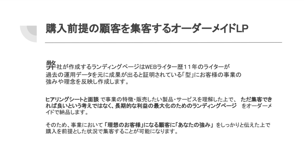 弊社では、LP制作やHPのみよりもマーケティング全般での成果改善を主な業務として行なっております。